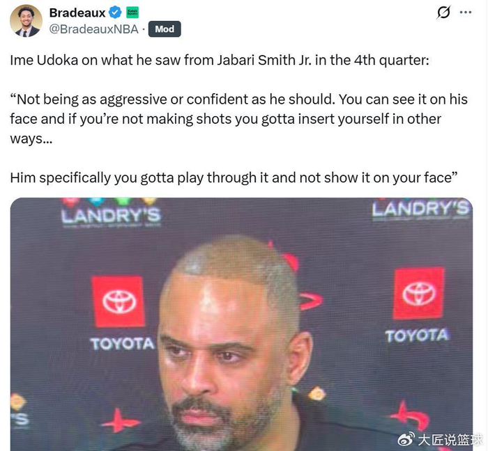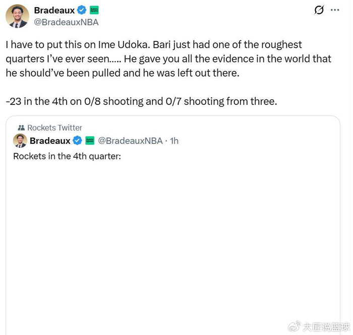 赛后连火箭媒体人Bradeaux都感到不解:“我这一次不得不把比赛失利的责任归咎于乌度卡,小贾打出了生涯最挣扎的一节比赛,他已经用各种方式证明他需要被换下场,结果乌度卡依旧将其留在场上。”