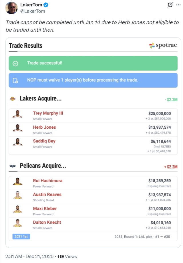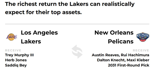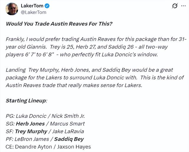 他建议湖人送出里夫斯、八村垒、克内克特、克勒贝尔、2031年湖人不保护首轮去鹈鹕换特雷-墨菲、赫伯特-琼斯、萨迪克-贝,也就是换来三个锋线资产。