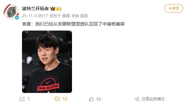 11月3日,@波兰特开拓者 官宣:我们已经从发展联盟混音队召回了中锋杨瀚森。