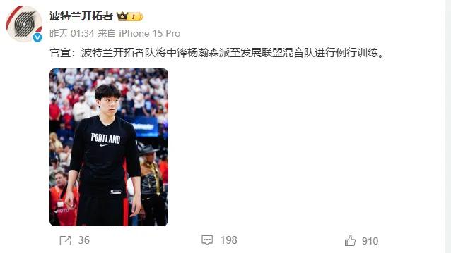 随后,杨瀚森工作室更新社媒发声:“为增强竞技能力,尽快适应NBA高强度的比赛水平,杨瀚森将于即日起,除参加开拓者队日常比赛及训练外,还会参加下属发展联盟球队的日常训练,以此加大训练量,增强体能储备的同时打磨个人技术。”