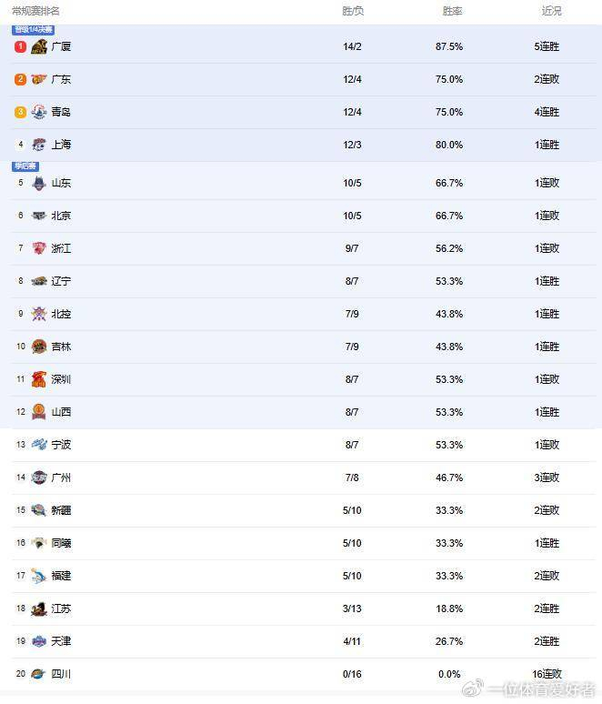 看下积分榜,排在第一位到第八位的球队分别是广厦、广东、青岛、上海、山东、北京、浙江和辽宁队。
